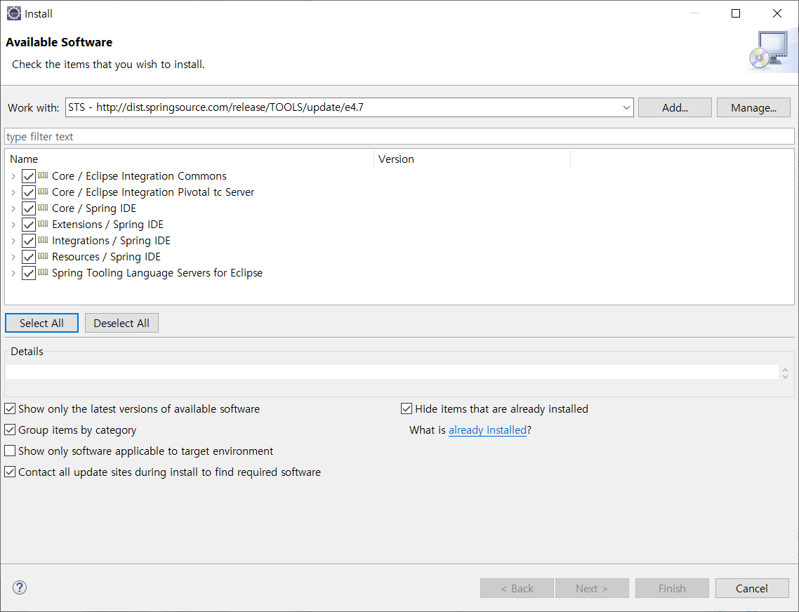 -> selection needed 창에서 모든 체크박스 체크 후 설치 진행 !