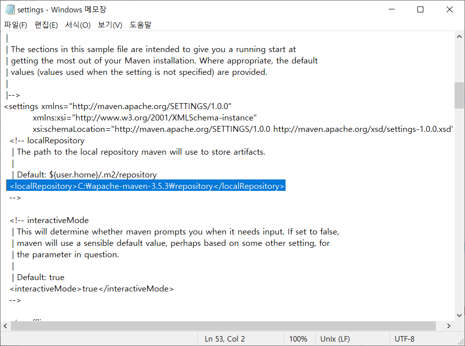 3. <localRepository> 태그를 찾아 repository 폴더의 경로를 붙여 넣기